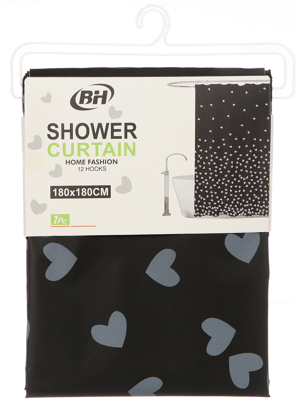 Штора для ванной 180х180 см, Peva, Белые сердца, черная, Y4-11154