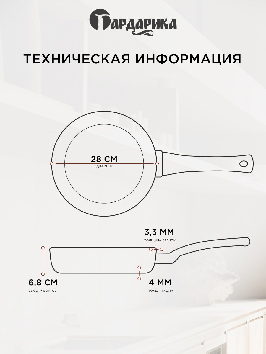 Диаметр 28 см, высота борта 68 мм, толщина дна 4 мм, толщина стенок 3,3 мм. Высокие борта позволяют готовить большие порции и тушить блюда без разбрызгиваний.