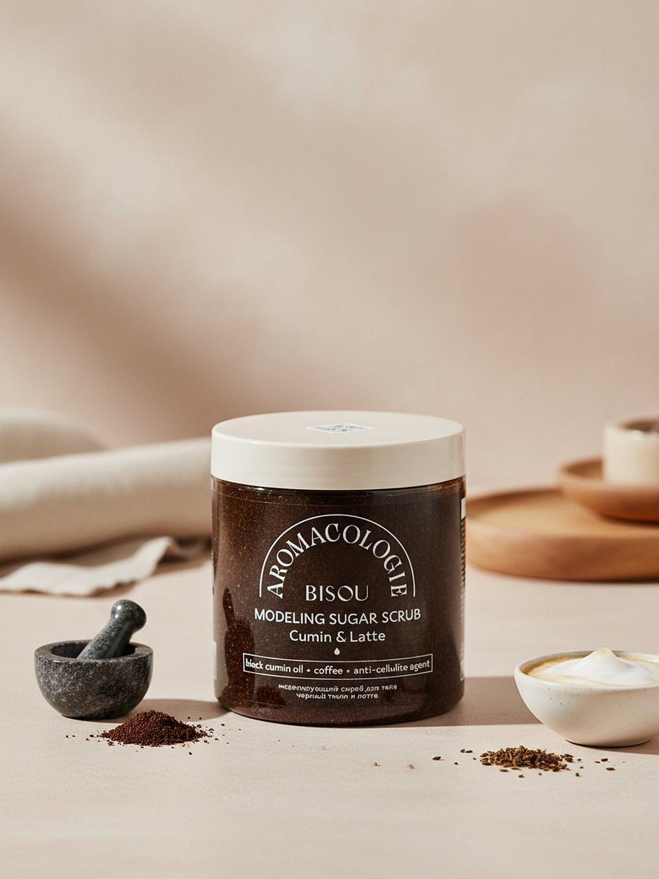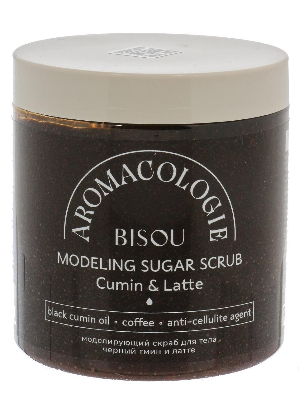 Скраб моделирующий Bisou Aromacologie: гладкая кожа и упругость за 2 недели — натуральный состав, чёрный тмин и латте, 250 мл.