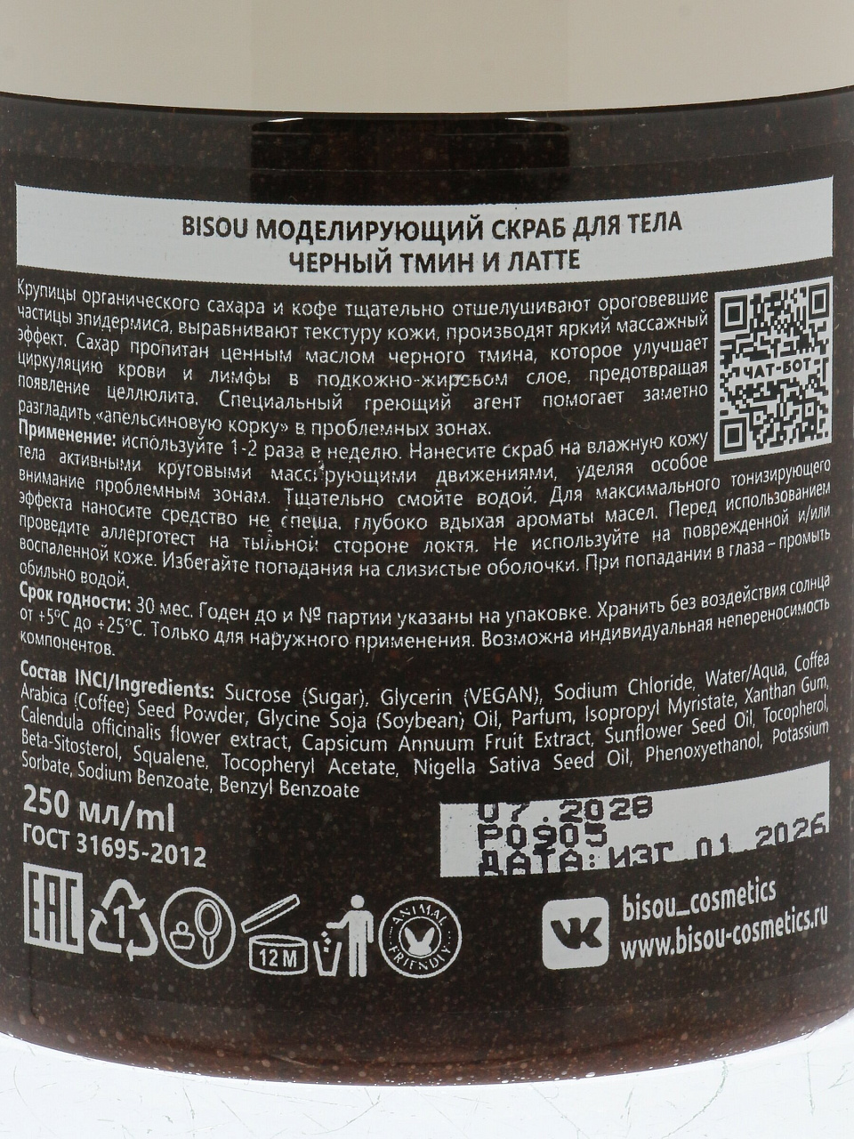 Вы можете приобрести «Скраб для тела Bisou, Aromacologie, Чёрный тмин и латте, 250 мл, моделирующий» и другие товары в нашем интернет-магазине в Старом Осколе по низким ценам и с бесплатным самовывозом.