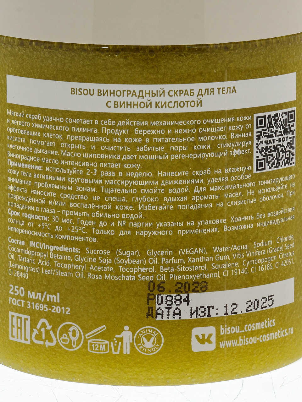 Скраб виноградный для тела Bisou Aromacologie с винной кислотой — обновление кожи за 7 дней, заметная гладкость и сияние без раздражения, оптимальный объём 250 мл.