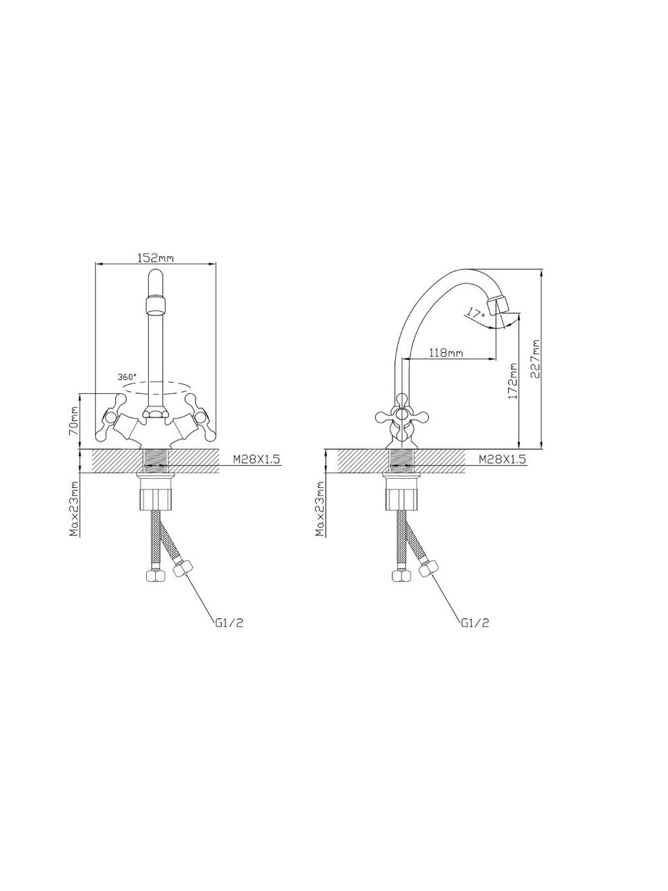 - Корпус из цинкового сплава с глянцевым хромированием, высокий излив (17,2 см) и компактная длина (11,8 см) — удобно для больших и малых раковин