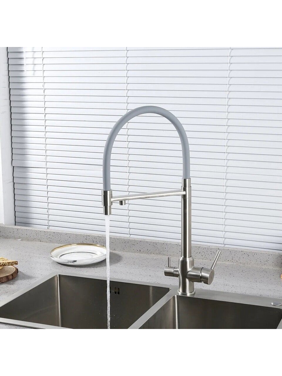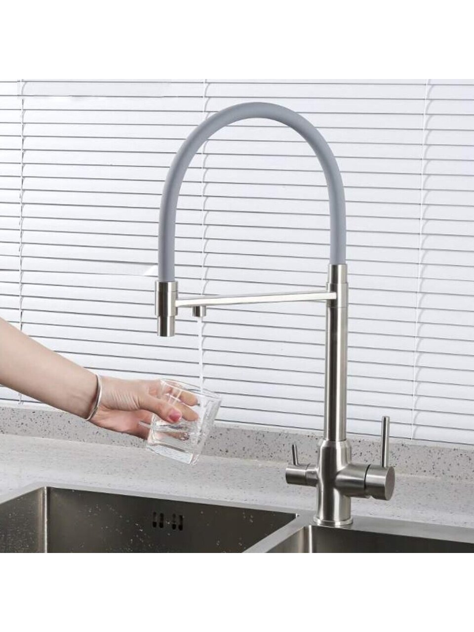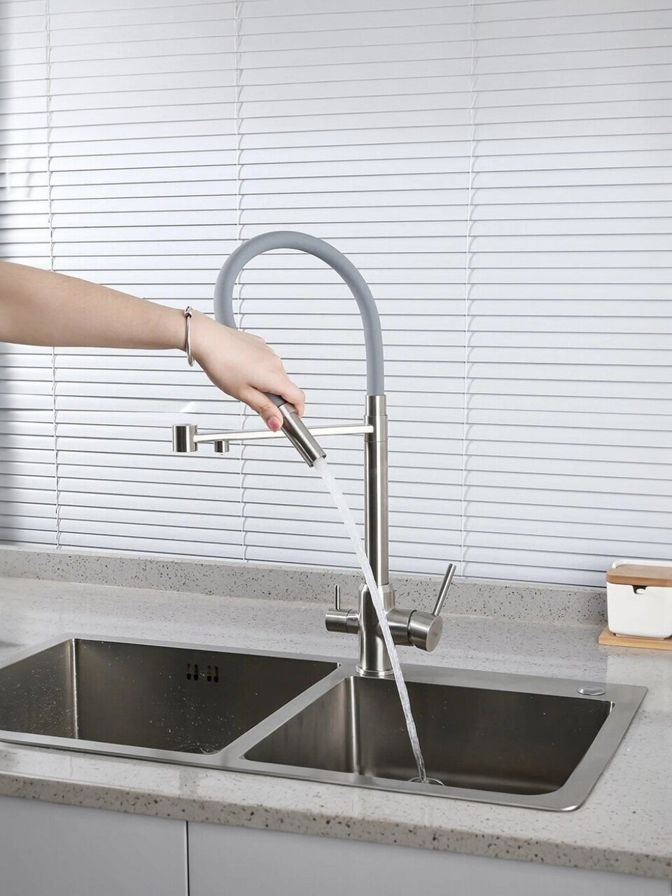 Установка смесителя не требует специальных навыков: гибкая подводка и стандартный крепёж на шпильку позволяют быстро заменить старую модель. Подходит для горизонтального монтажа, а универсальный серый цвет гармонирует с любой кухонной мебелью. Если вы спрашиваете, как использовать смеситель для фильтрации воды, — просто переключите режим и получайте чистую воду для питья и приготовления пищи.