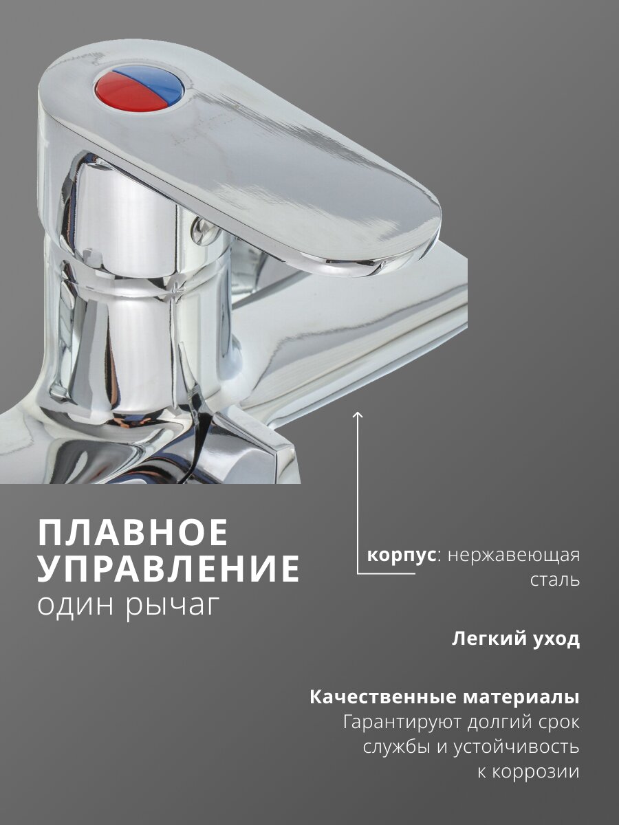 Корпус выполнен из цинкового сплава с глянцевым хромированным покрытием, запорный механизм — керамический картридж. Это обеспечивает высокую прочность и долговечность при интенсивном использовании.