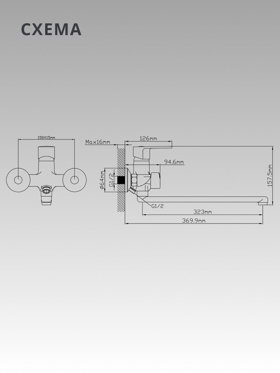 Смеситель устанавливается вертикально на стену через 2 монтажных отверстия (межосевое расстояние — 150 мм). Крепление — эксцентрики, стандарт подводки 1/2".