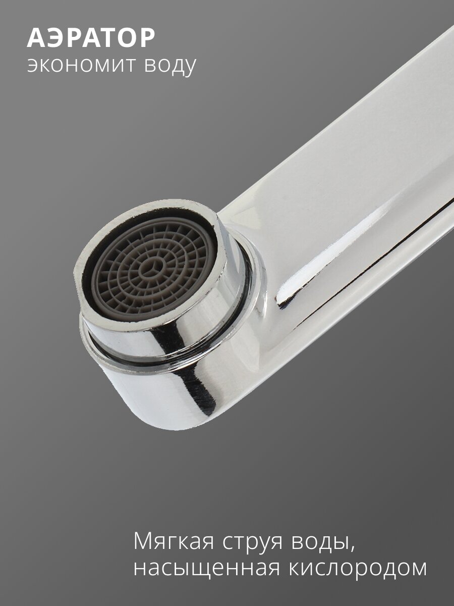 - Длинный поворотный излив 35 см и корпус из цинкового сплава с керамическим картриджем — надёжность и долговечность
