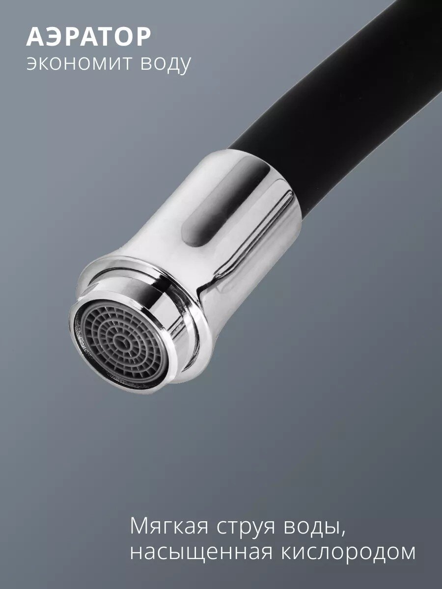 - Гибкий излив 30 см — легко направлять поток воды, удобно мыть посуду и наполнять высокую посуду