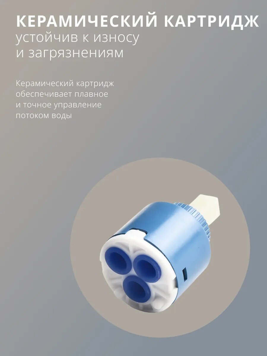 Корпус выполнен из цинкового сплава с глянцевым хромированием, а запорный механизм — керамический картридж. Такая комбинация обеспечивает до 5 лет эксплуатации без протечек и коррозии.