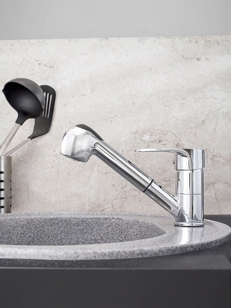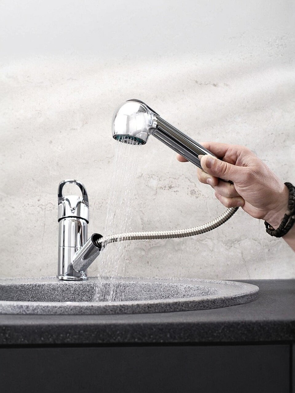 Смеситель для кухни РМС SL52-014 с выдвижным изливом: удобно мыть посуду, экономить воду и обновить интерьер кухни — решение для тех, кто ценит комфорт и стиль.