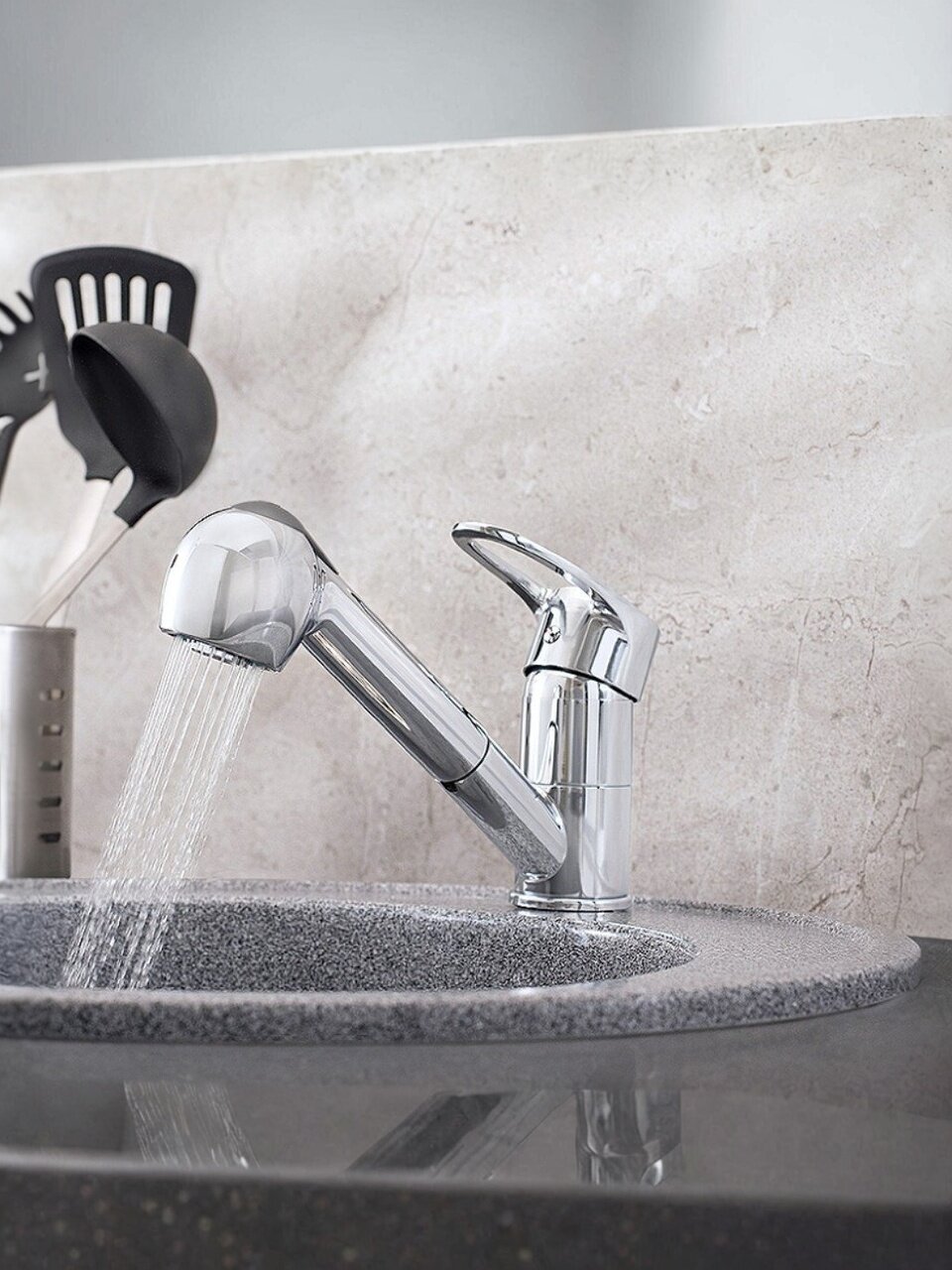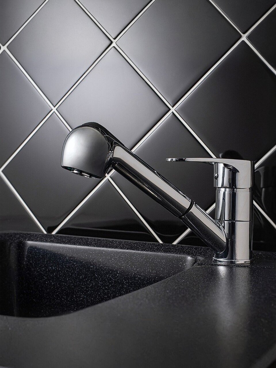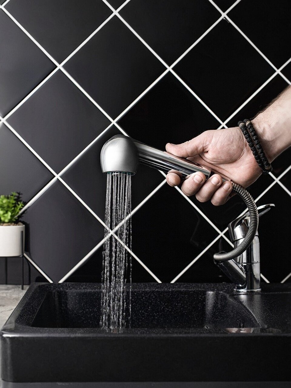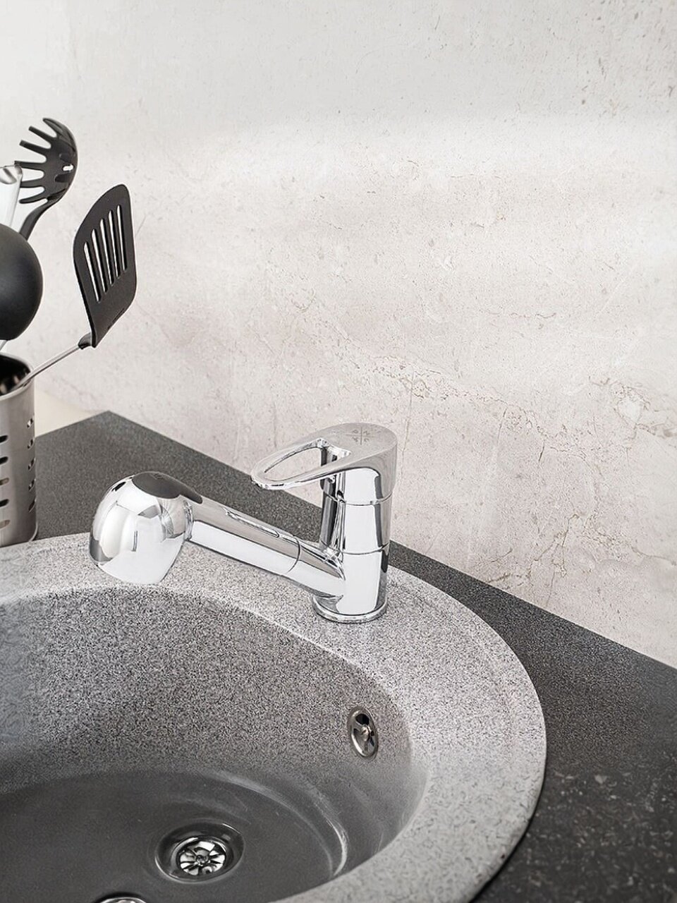 - Выдвижной излив — легко наполнять высокие кастрюли, мыть овощи и труднодоступные зоны