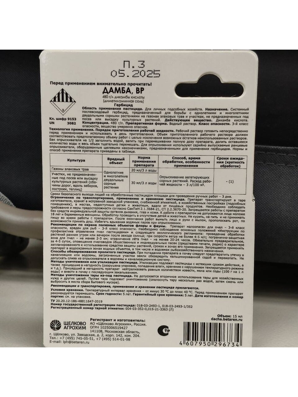 Откройте для себя эффективное средство для борьбы с сорняками - гербицид Дамба от Щелково Агрохим! Это универсальное решение для вашего газона, обеспечивающее период защитного действия от 4 до 6 недель. Идеально подходит для обработки участков вдоль заборов, теплиц и построек.