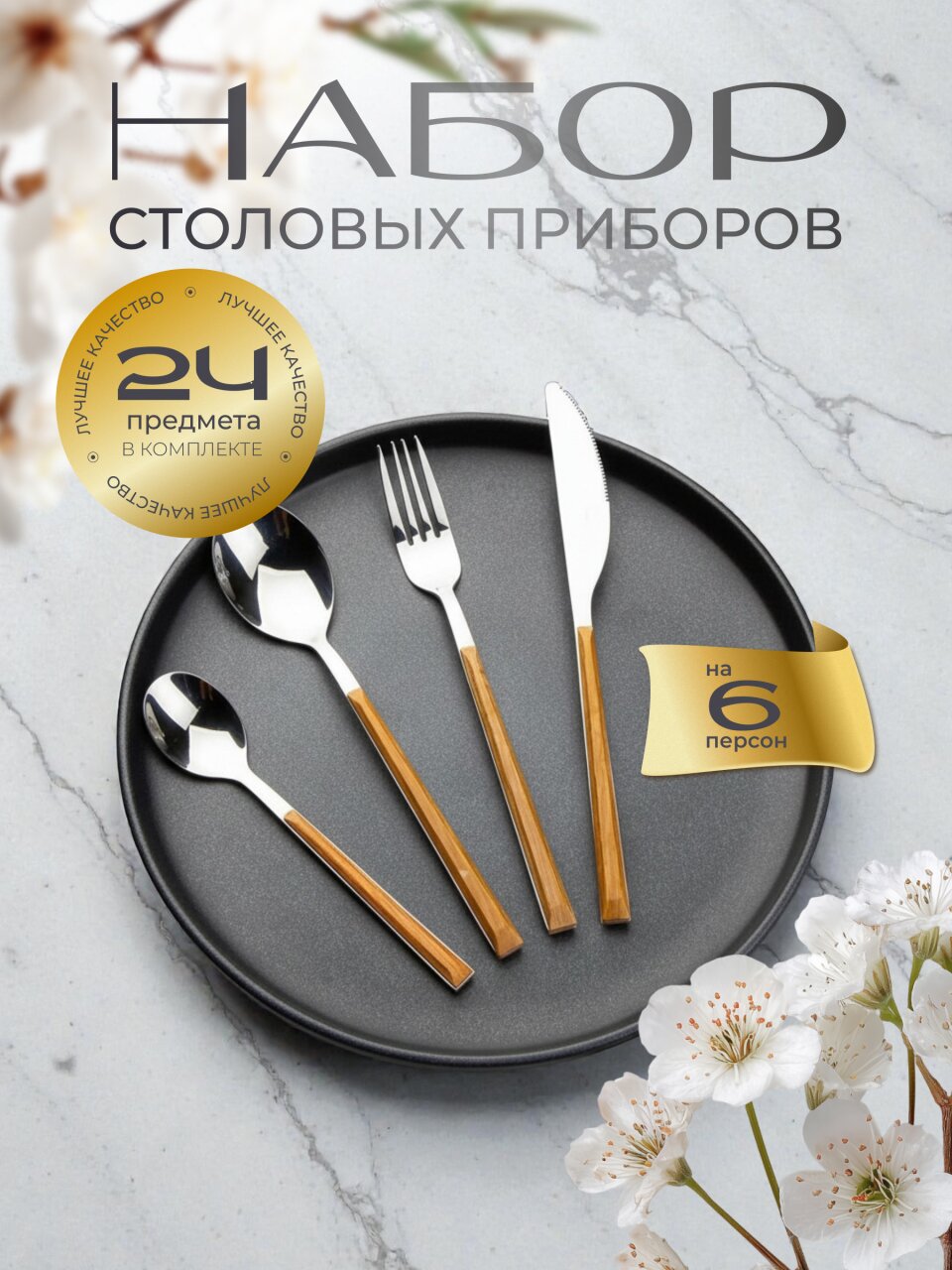 Набор столовых приборов 24 предмета: стильный коричневый глянец для 6 персон — практичное решение для дома, дачи и подарка