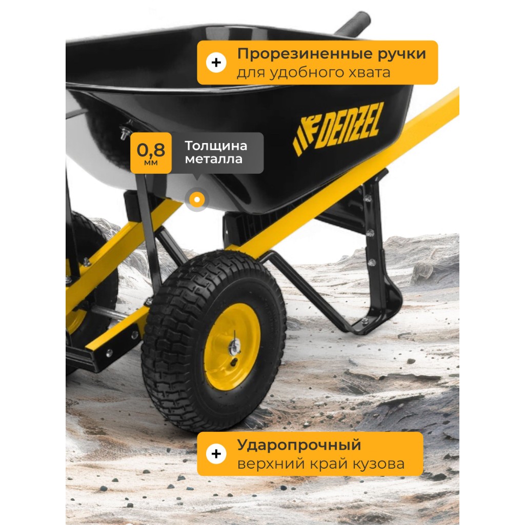 Тачка строительная усиленная от Denzel - это незаменимый помощник в строительных и садовых работах. Созданная для профессионалов и любителей, она сочетает в себе прочность, вместительность и маневренность, что делает ее идеальным выбором для любых задач. С грузоподъемностью до 250 кг и объемом 140 литров, она справится даже с самыми тяжелыми грузами, обеспечивая комфорт и удобство при транспортировке.