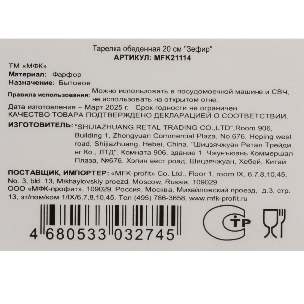 Тарелка обеденная фарфоровая 20 см MFK Зефир — стильное решение для сервировки и ежедневного использования: прочный материал, лаконичный дизайн, оптимальный размер для любого блюда.