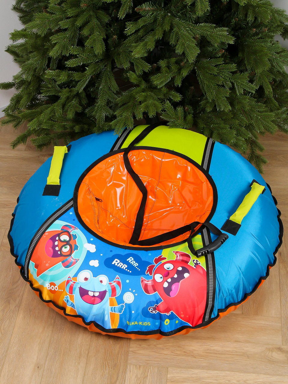 Санки-ватрушка Nika 95 см с буксировочным тросом и ярким принтом «Монстрики»: безопасное катание для детей от 12 лет, прочная ткань, легкая транспортировка.