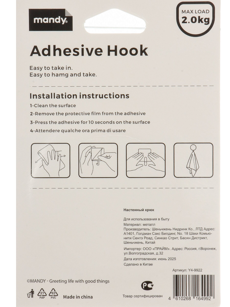 Крючок для ванной, матовое покрытие, нерж сталь, Y4-9922