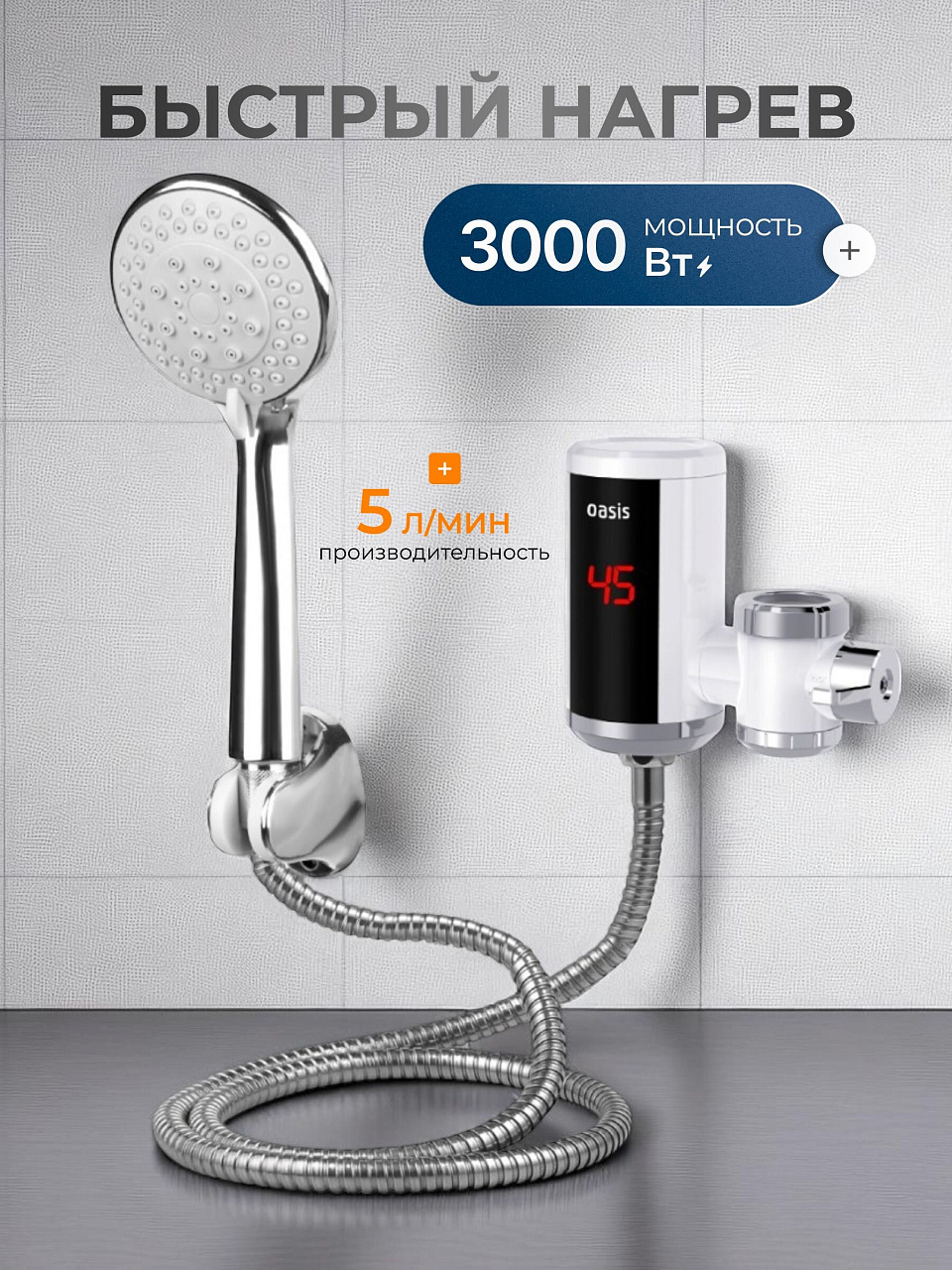 Водонагреватель электрический, проточный, Oasis, NW, до +60 °C, съемный, 5 л/мин, 3 кВт