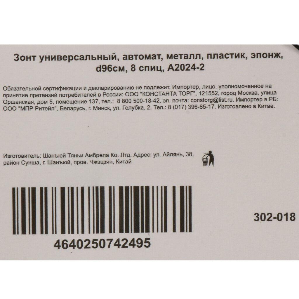Вы можете приобрести «Зонт унисекс, автомат, 8 спиц, 96 см, металл, пластик, эпонж, в ассортименте, 302-018» и другие товары в нашем интернет-магазине в Ставрополе по низким ценам и с бесплатным самовывозом.