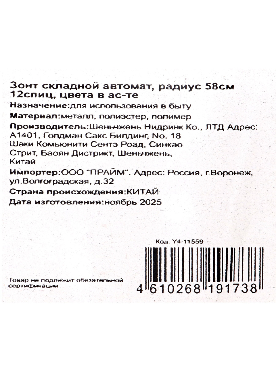 Из каких материалов изготовлен зонт Y4-11559?